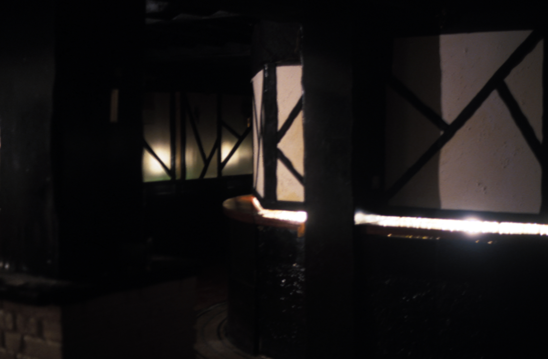 The result was a mock-tudor canopy that extended the structure of the bar to an absurd level. A 3cm gap was left between the public and private parts of the establishment and this was obscured by lines of soiled glasses. All of the light within the room was achieved by the glow from within the bar through this variable lens. Within the enclosed area, fans moved objects around and the answerphone machine was fitted with a tape-loop which continuously played a Tammy-Wynett verse.