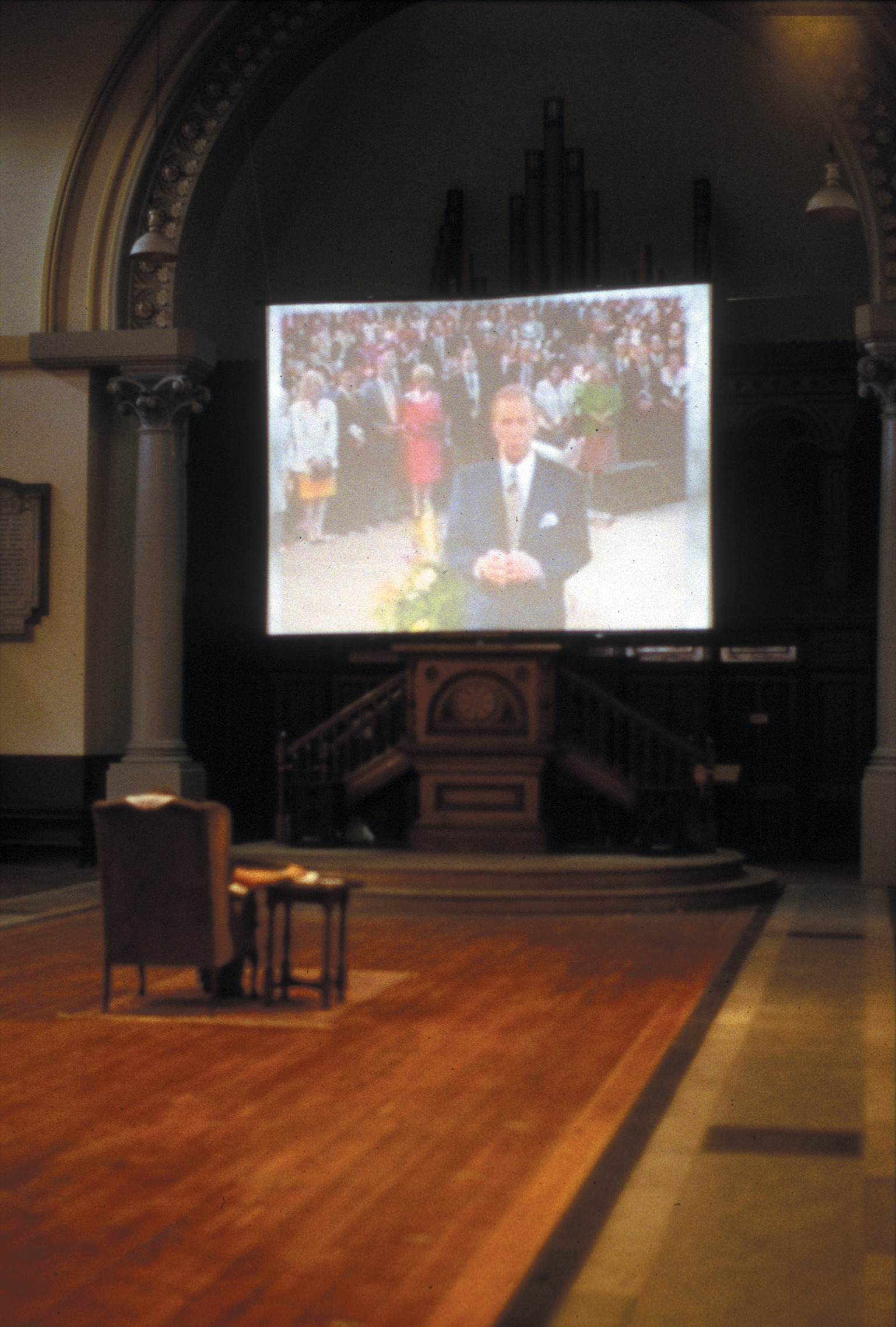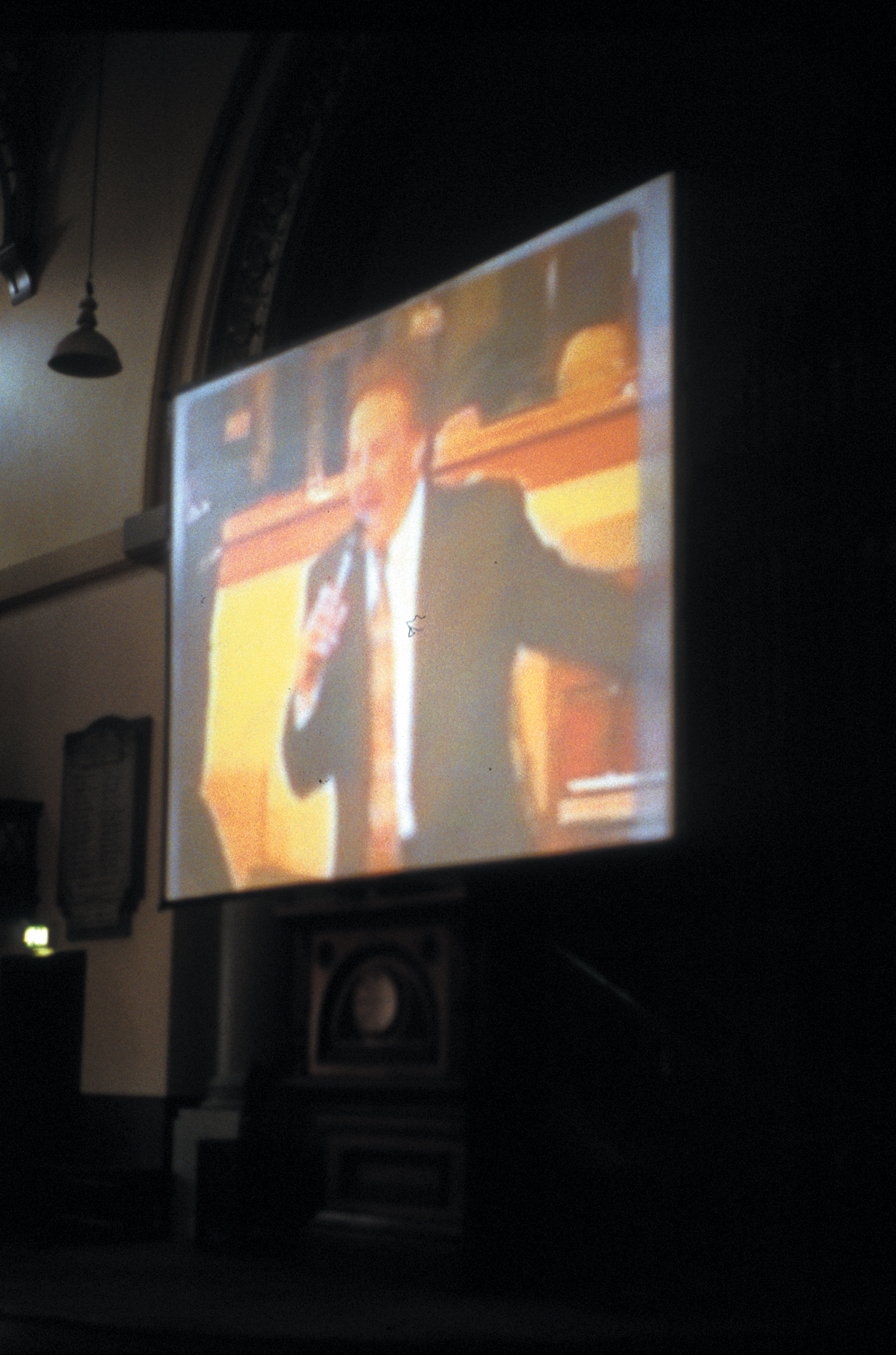Date: 10th June 2000Video installation in a de-consecrated church, reflecting on the spectacularisation of the role of the church and faith