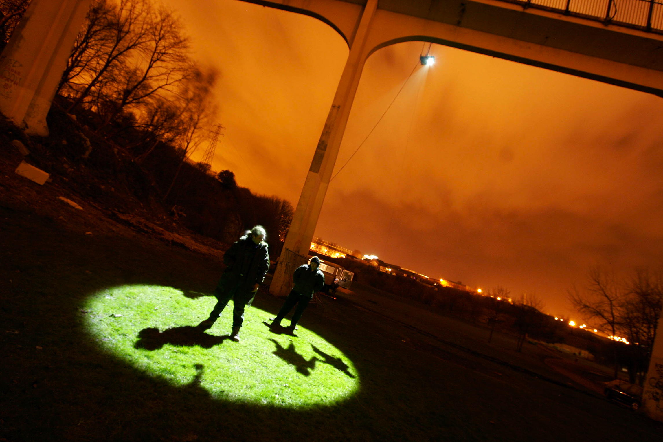 The area surrounding the River Wear is no longer public territory and was abandoned after the collapse of glass, coal and shipbuilding industries forced many people to relocate. In 2005, Sunderland Arc commissioned Cotterrell to develop a project that would engage with disused sites in the area. Cotterrell worked with Dan Dubowitz and Ben Hall in the creation of a series of interventions that could project subtle interventions into the landscape. ‘Planted’ stories of sightings preceded the appearance of a giant military balloon, tethered and hovering above the ground and projecting anonymous shadows onto the ground.