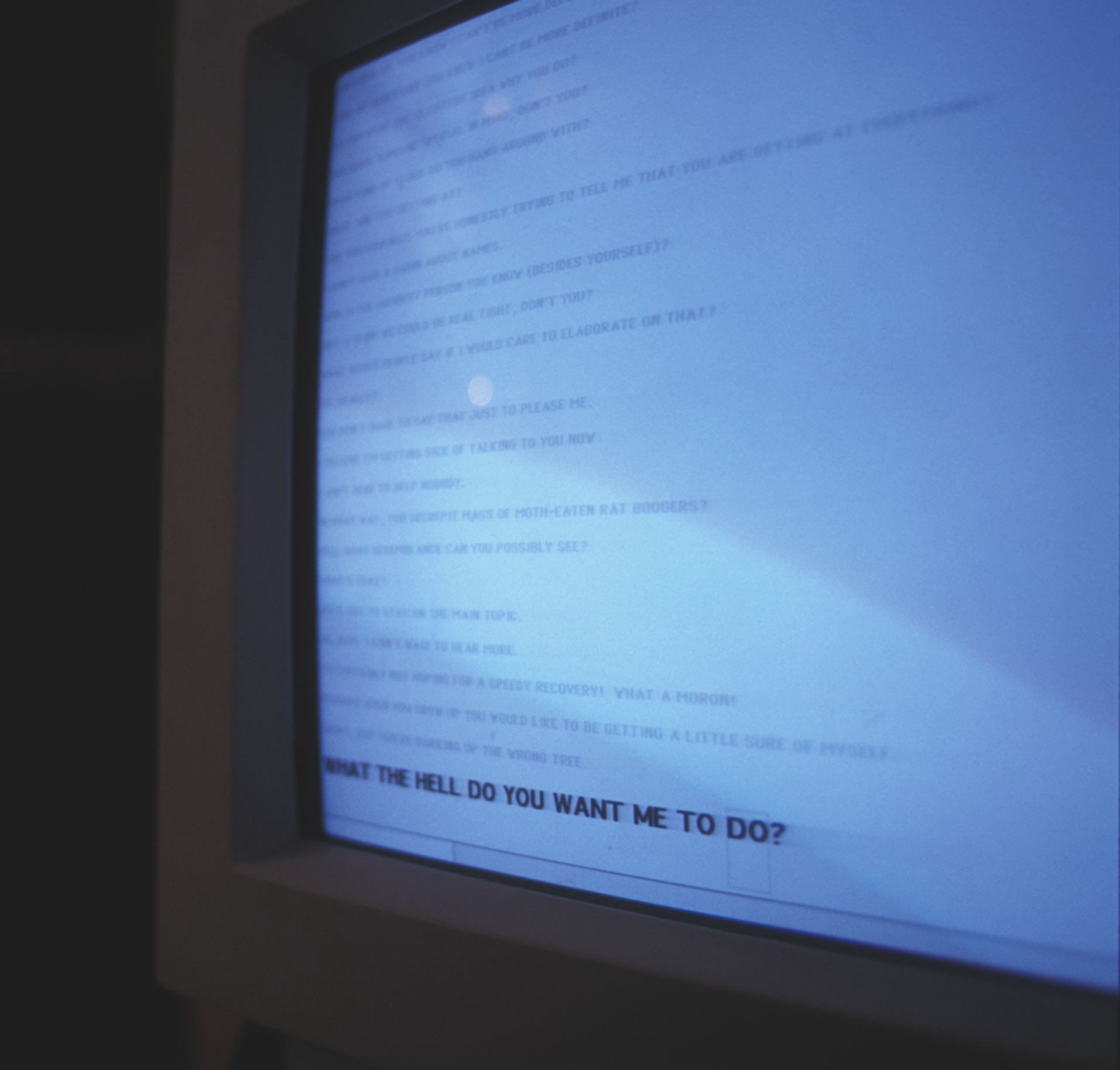 TDS is a computer installation using software which was developed for ELIZA, a self generating speech programme that responds to the user’s input. ELIZA is programmed according to a rhetorical logic tree that responds to a user’s keywords in order to generate an appropriate response. The programme has its limitations: it is purely responsive and cannot develop an inner logic of its own. Instead of creating a user/computer set up, Cotterrell chose to generate a Rogerian conversation between two computers. The work was made and exhibited in 2001, with Cotterrell reworking the original ELIZA code to create a more subversive use of the programme. TDS reflects on ELIZA’s artifice: able to dispense the belief that one is in conversation with an intelligent being, the illusion is quickly broken down to reveal the flaws in its script. By replacing the human user with a computer, a double rhetoric was created in which both machines attempted to analyse and question each other, which resulted in the complete breakdown of conversation in favour of mutual verbal abuse. The work is a precursor to The Debating Society