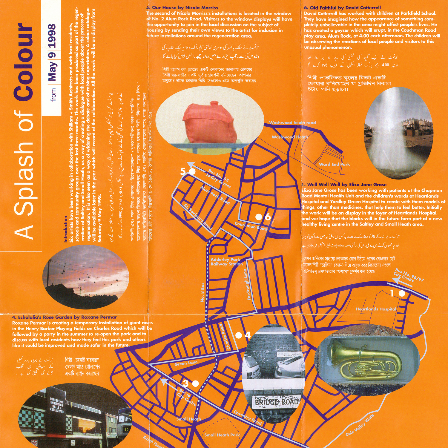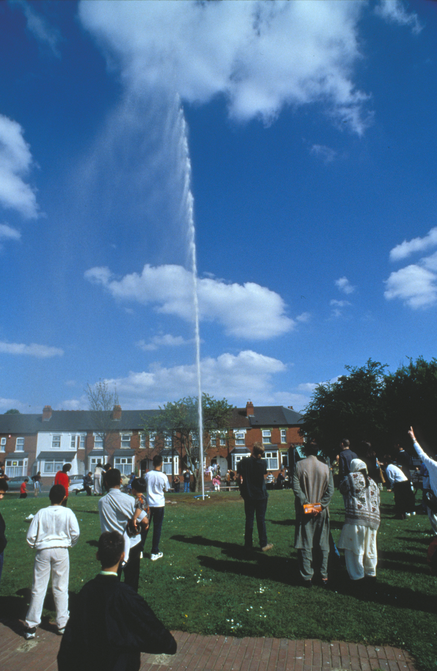 But there is another level of achievement which we are less able to quantify but to me is equally important. I feel that the artists have gone some way to assisting our understanding of Saltley and Small Heath. David Cotterrell’s geyser creates a landmark in an area that until last month was only notable for crime and decay. Roxane Permar, under the guise of her alter ego Echolalia, has created giant roses which have found a shared aesthetic appreciated equally by elderly white residents as well as the Asian population in that area. Susan Hiller’s transformation of the normal and familiar (and graffiti covered) black and white street signs into a leafy and colourful manifestation of local culture has also posed a new identity (and incidentally a touch of the feminine).