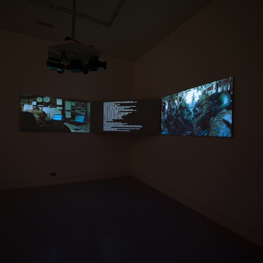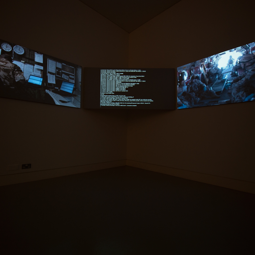 Cotterrell's installation work 9-Liner was shown as a three-channel video projection for the first time in this show at Cafe Gallery Projects in London. 9-Liner is a three-channel time based work, which explores the dislocation between the parallel experiences of casualties within theatre.