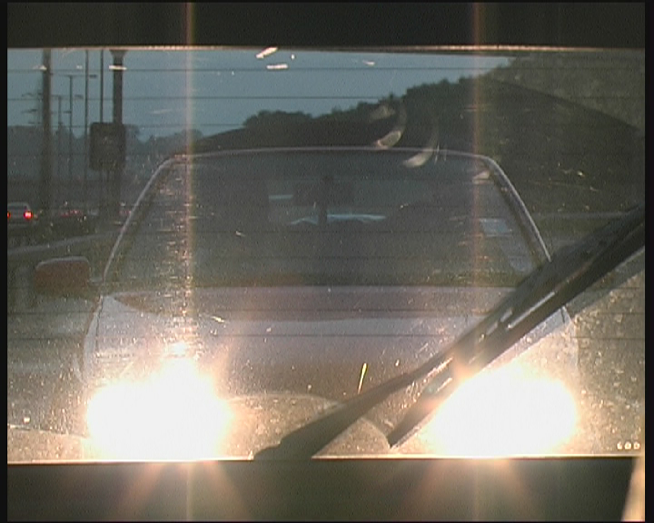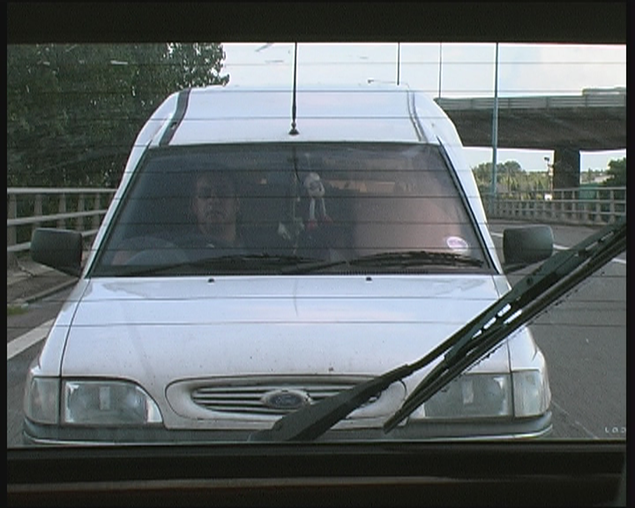 Car Culture filmed a non-consenting driving public as Cotterrell covered over two thousand miles of UK motorways in his Volvo 340. Recording tail-gaiters’ antics as he drove between 70 and 80 miles an hour in the passing lane, Cotterrell used suction cups to attach a video camera to the interior of his car windscreen. With the lens pointing to the rear window, he was able to start and stop filming while still driving. The rationale behind the editing of Car Culture dictated that, if an approaching car’s license plate were close enough to be read, the footage would qualify for inclusion in the work. All participating vehicles are credited, with their individual licence plate details appearing before they make their entrance onto Cotterrell’s playfully malevolent stage.