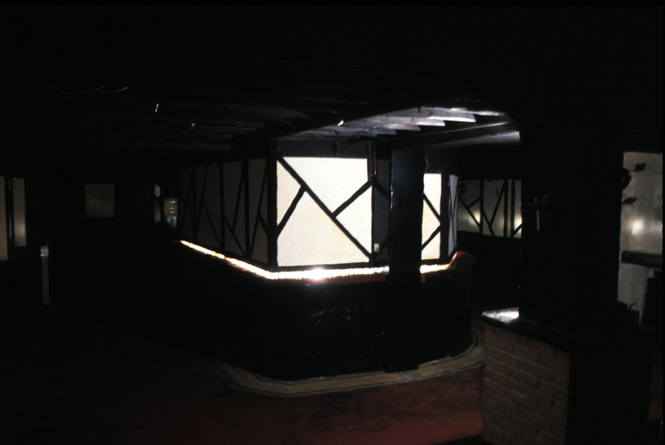 The result was a mock-tudor canopy that extended the structure of the bar to an absurd level. A 3cm gap was left between the public and private parts of the establishment and this was obscured by lines of soiled glasses. All of the light within the room was achieved by the glow from within the bar through this variable lens. Within the enclosed area, fans moved objects around and the answerphone machine was fitted with a tape-loop which continuously played a Tammy-Wynett verse.