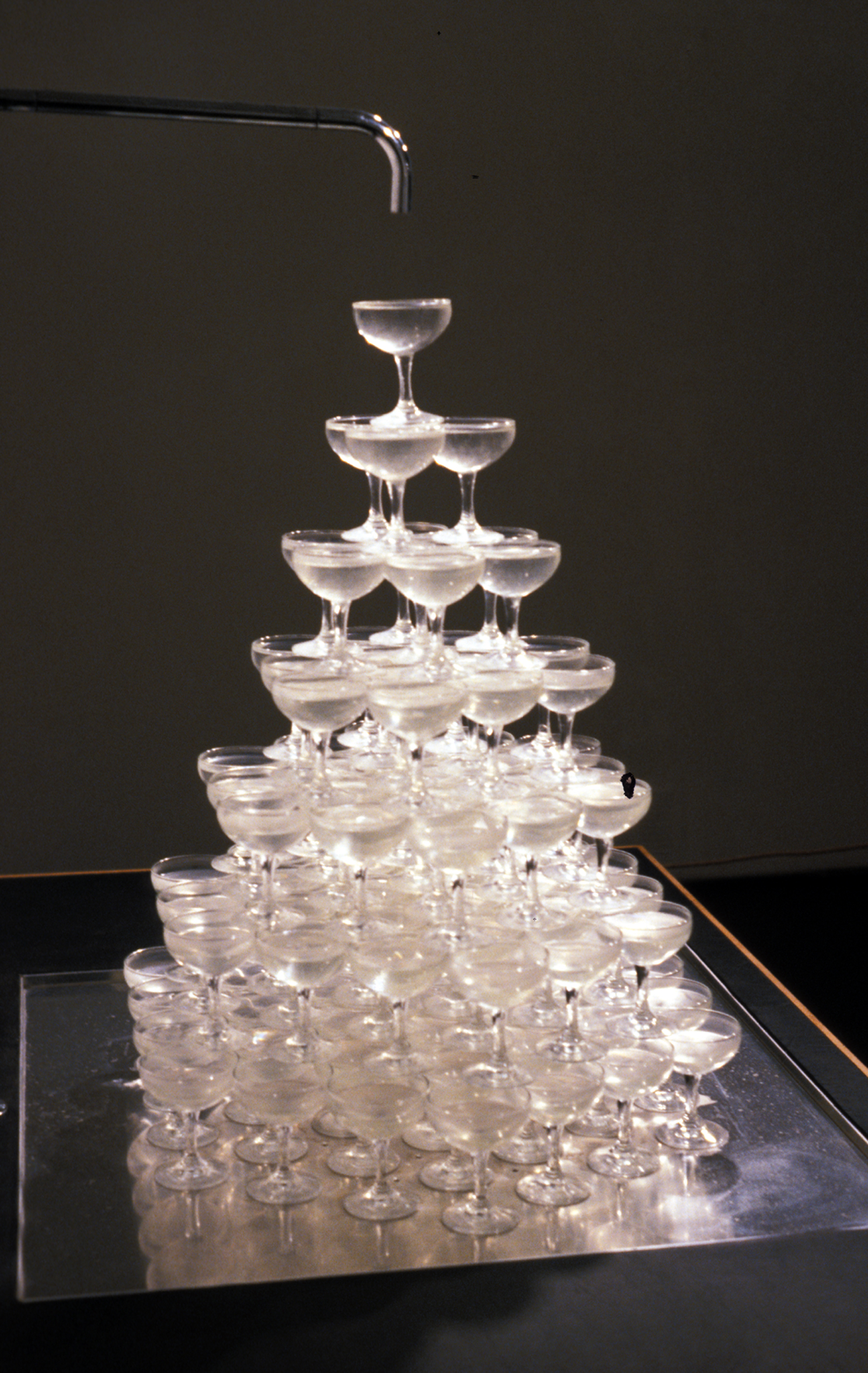 A sculptural installation of champagne glasses overflowing in a cascade of redistributed champagne