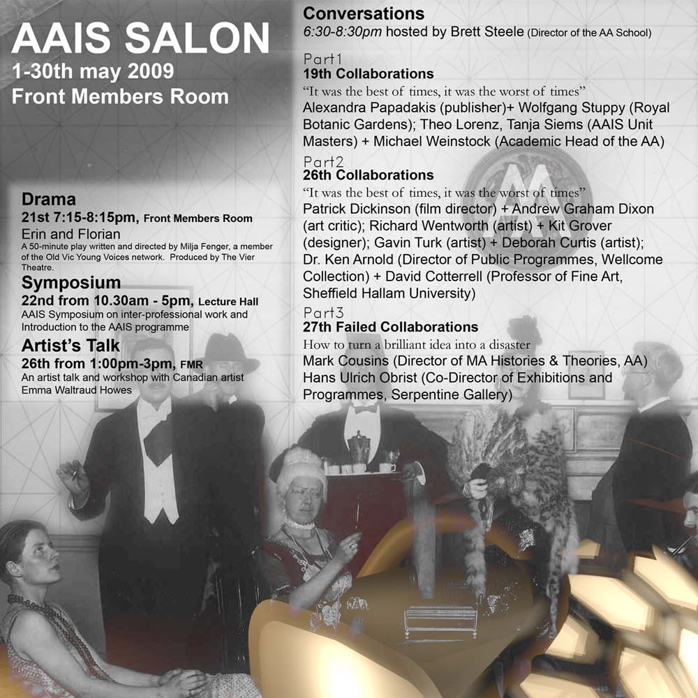 The second evening in the Salon Conversations: Collaboration series of presentations, panel discussions and open debate. Set in a former Georgian drawing room in the heart of today's Architectural Association, the exhibition Salon aims to restore the room to its original function as a place of stimulating conversation and the pursuit of knowledge. The AAIS is a new AA programme that gives experienced individuals an opportunity to step away from their existing professional or academic activities and enter the unique AA environment in order to see their own field and interests in a new light.